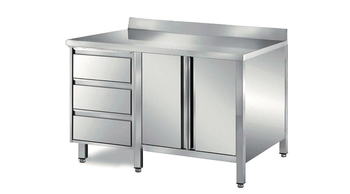 Il piano di lavoro in acciaio INOX AISI 304 è alto 40 mm ed è rinforzato da un pannello in legno melaminico bilaminato idrofugo