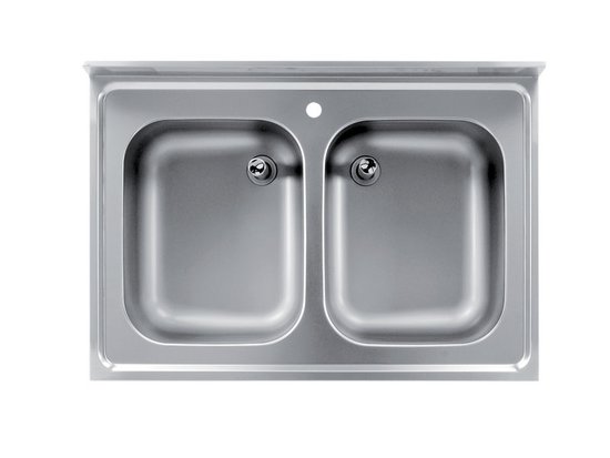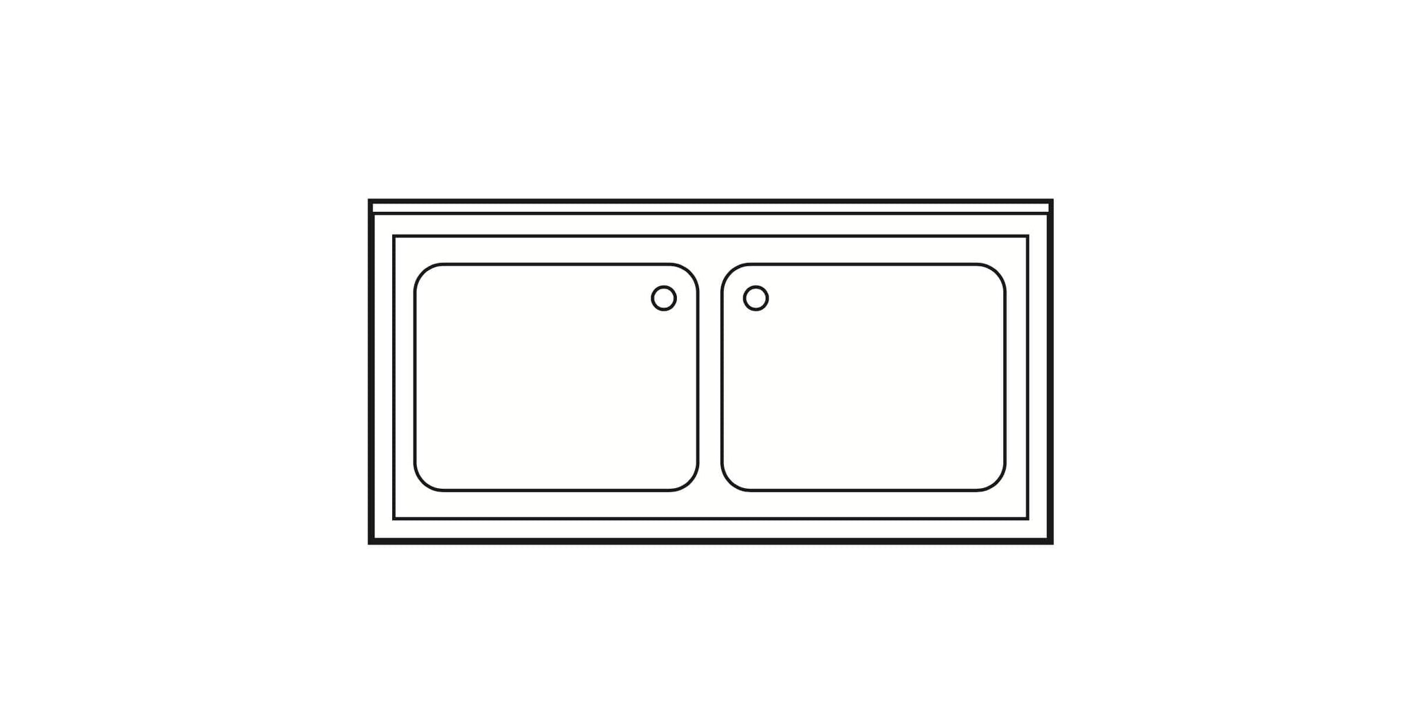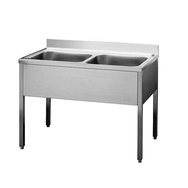 Lavatoio in acciaio inox AISI 304 con 2 vasche e alzatina posteriore paraspruzzi di altezza 100 mm.