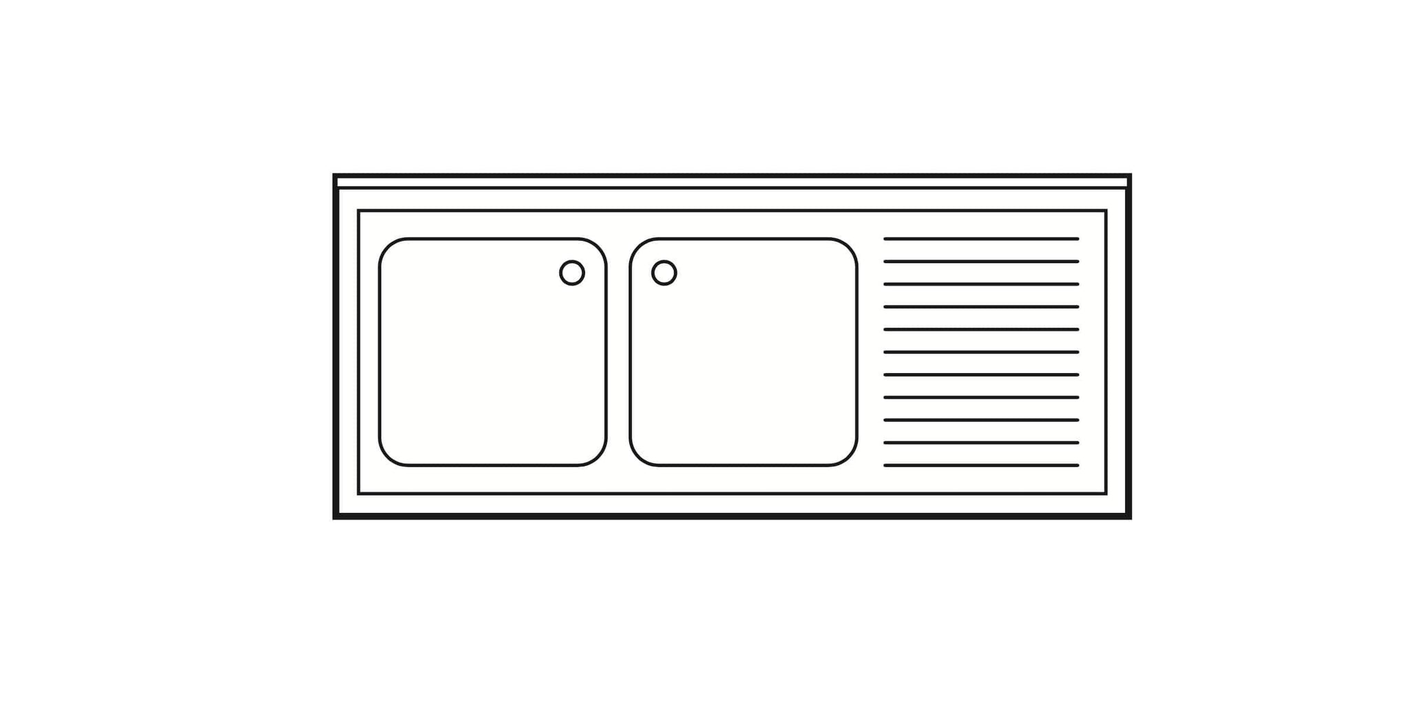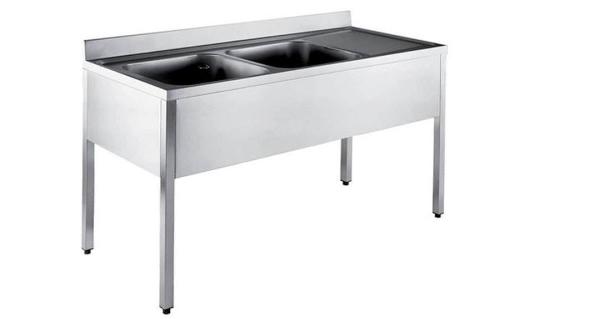 Lavatoio in acciaio inox AISI 304 con 2 vasche, gocciolatoio a destra e alzatina posteriore paraspruzzi di altezza 100 mm.