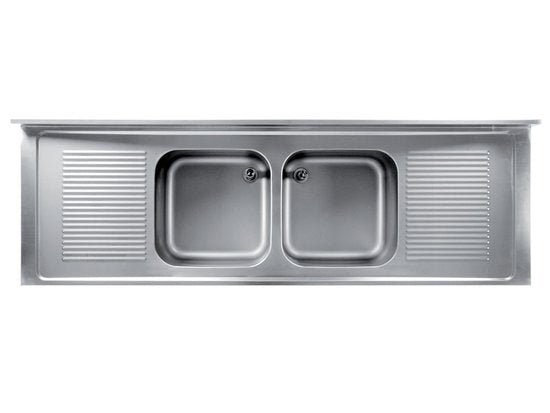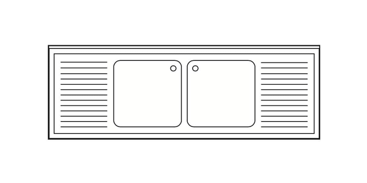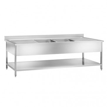 Lavatoio su gambe e sottopiano in acciaio inox AISI 304 con 2 vasche, 2 gocciolatoi e alzatina posteriore paraspruzzi.
